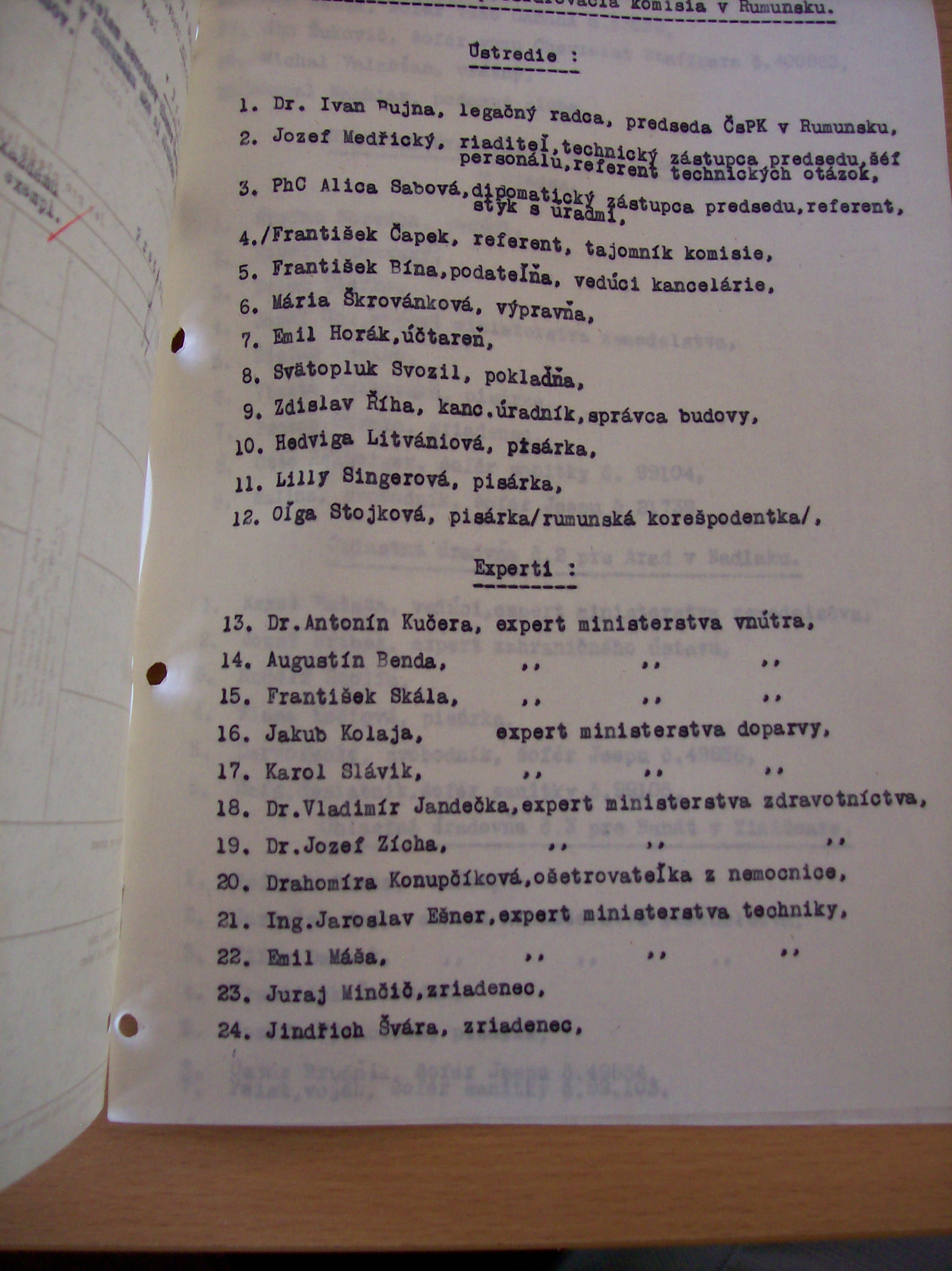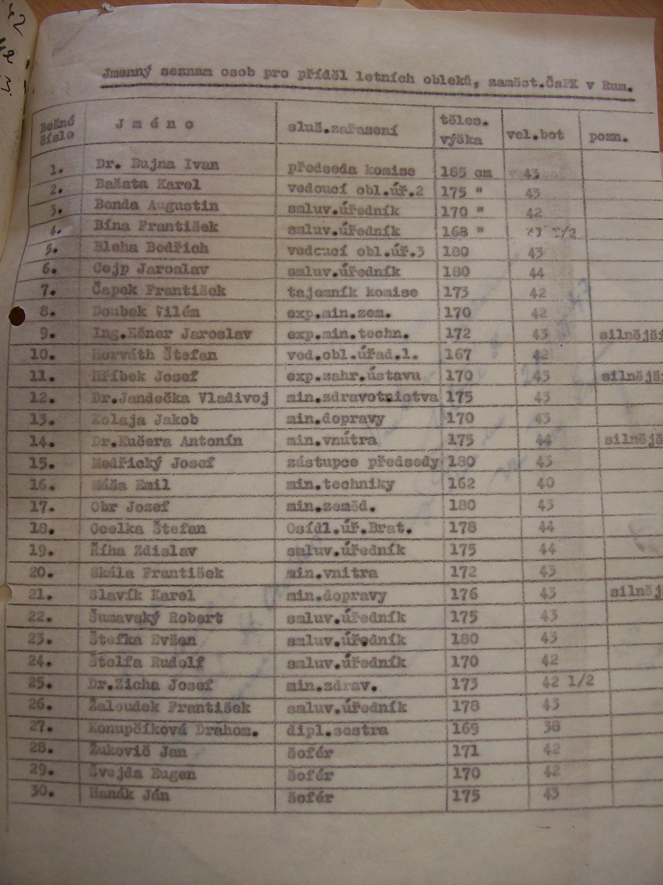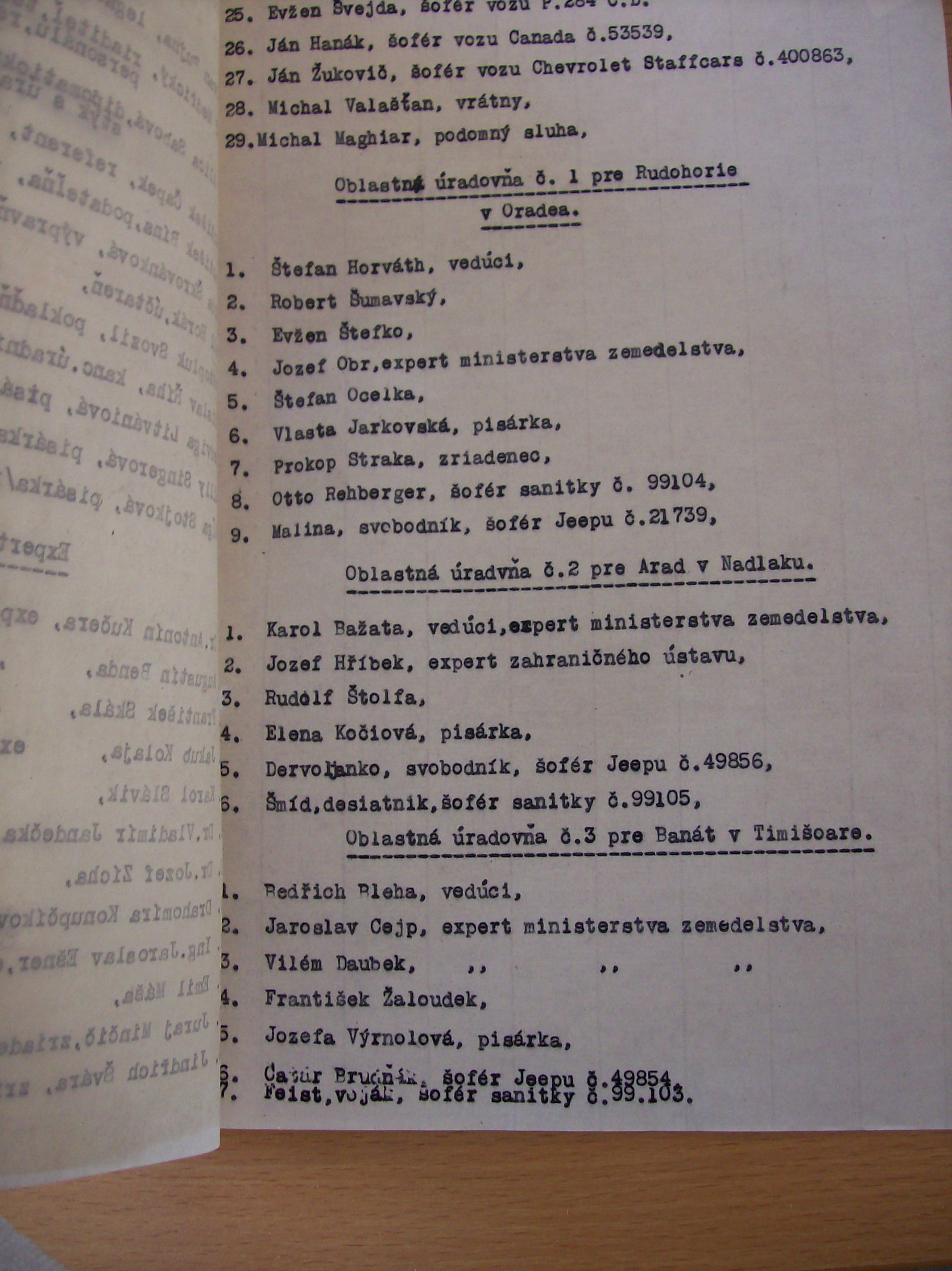 Seznam úředníků a dalších zaměstnanců Čs. přesídlovací komise v Oradeji, včetně výšky a velikosti bot pro účely přídělu obleků a obuvi. K zaměstnancům komise patřili v různé době mj. Ivan Bujna, Josef Medřický, Alice Sabová, František Čapek, František Bína, Svatopluk Svozil, Zdislav Říha, Hedviga Litvániová, Lilly Singerová, Olga Stojková, Štefan Horváth, Robert Šumavský, Evžen Štefko, Štefan Ocelka, Vlasta Jarkovská, František Štědronský, Bedřich Bleha, Viliam Doubek, Vladivoj Jandečka, Mária Škrovánková, Drahomíra Konupčíková.
