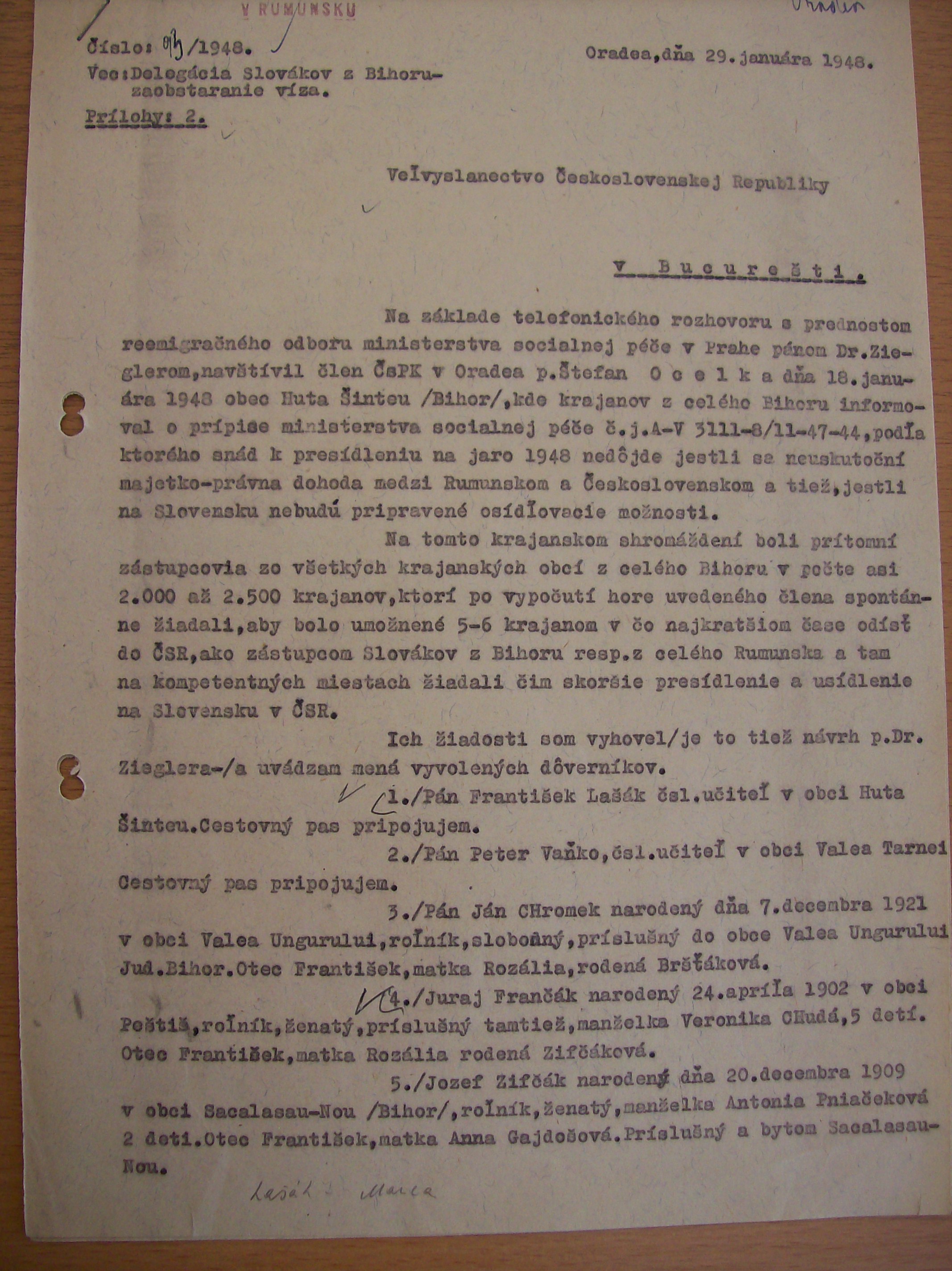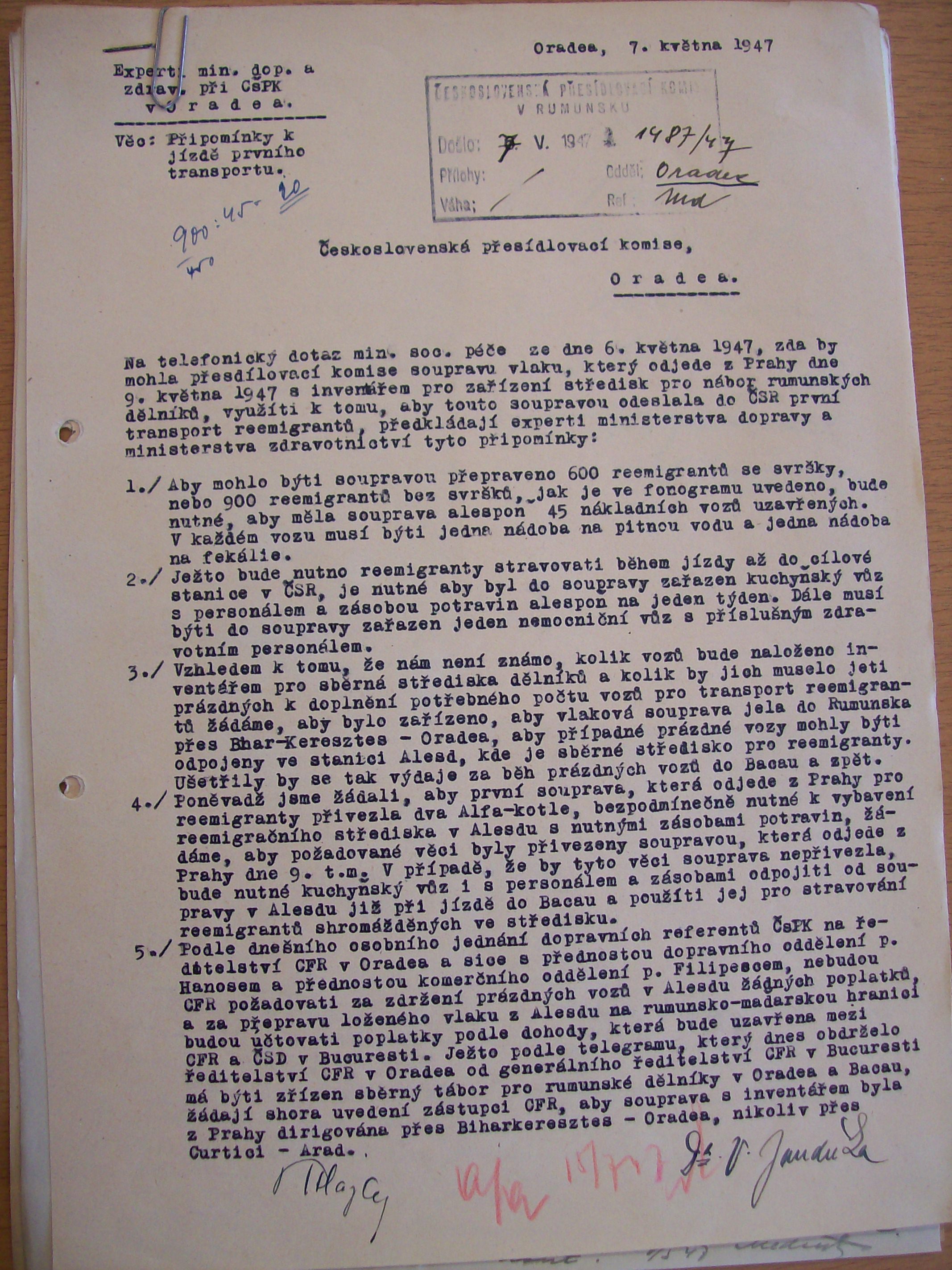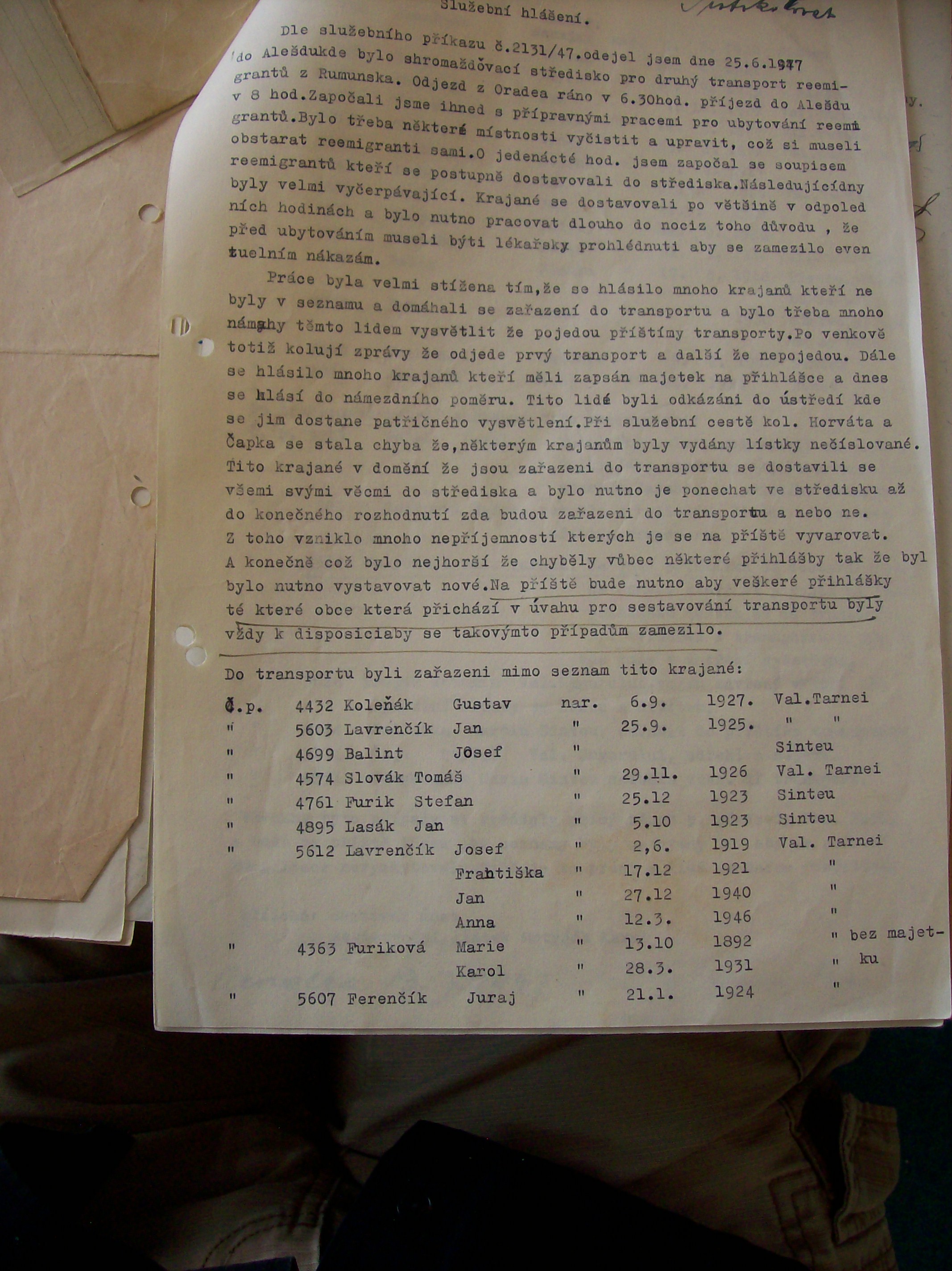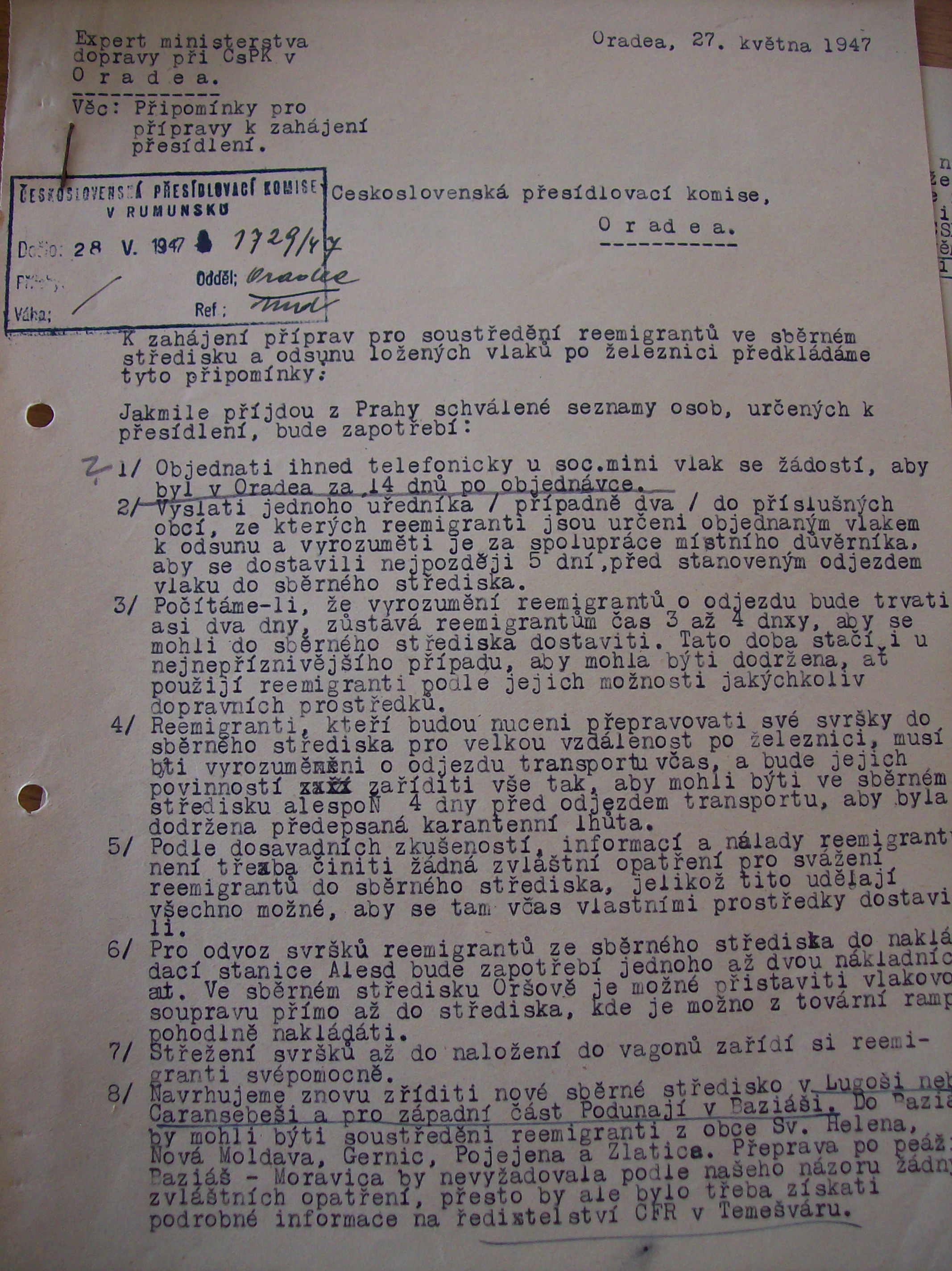 Na této stránce najdete archivní dokumenty ilustrující, jak v letech 1947-49 probíhala organizovaná reemigrace rumunských Slováků do ČSR. (Dokumenty vesměs pocházejí z archivu Československé přesídlovací komise v Oradeji, uloženého v Národním archivu ČR.)