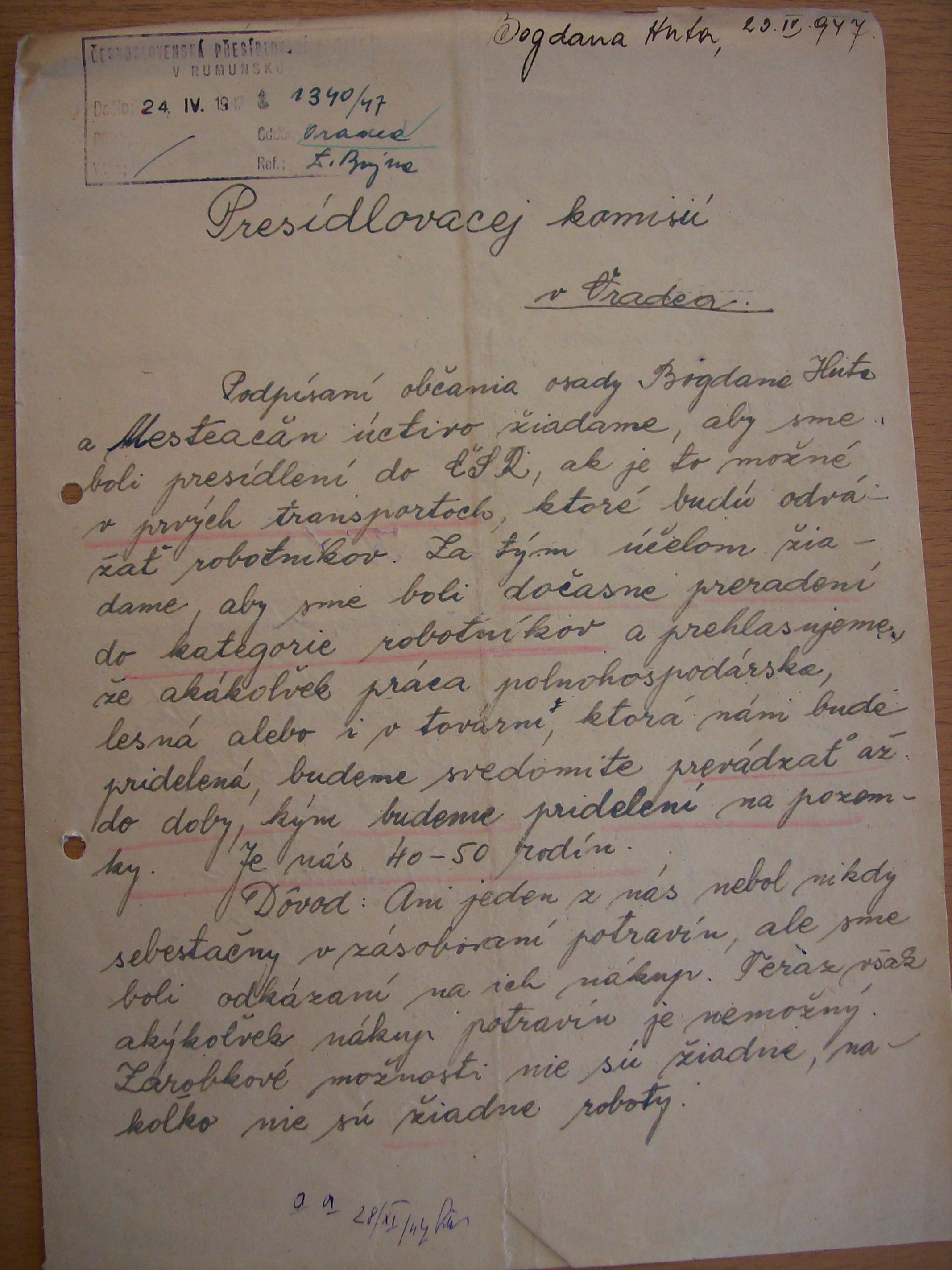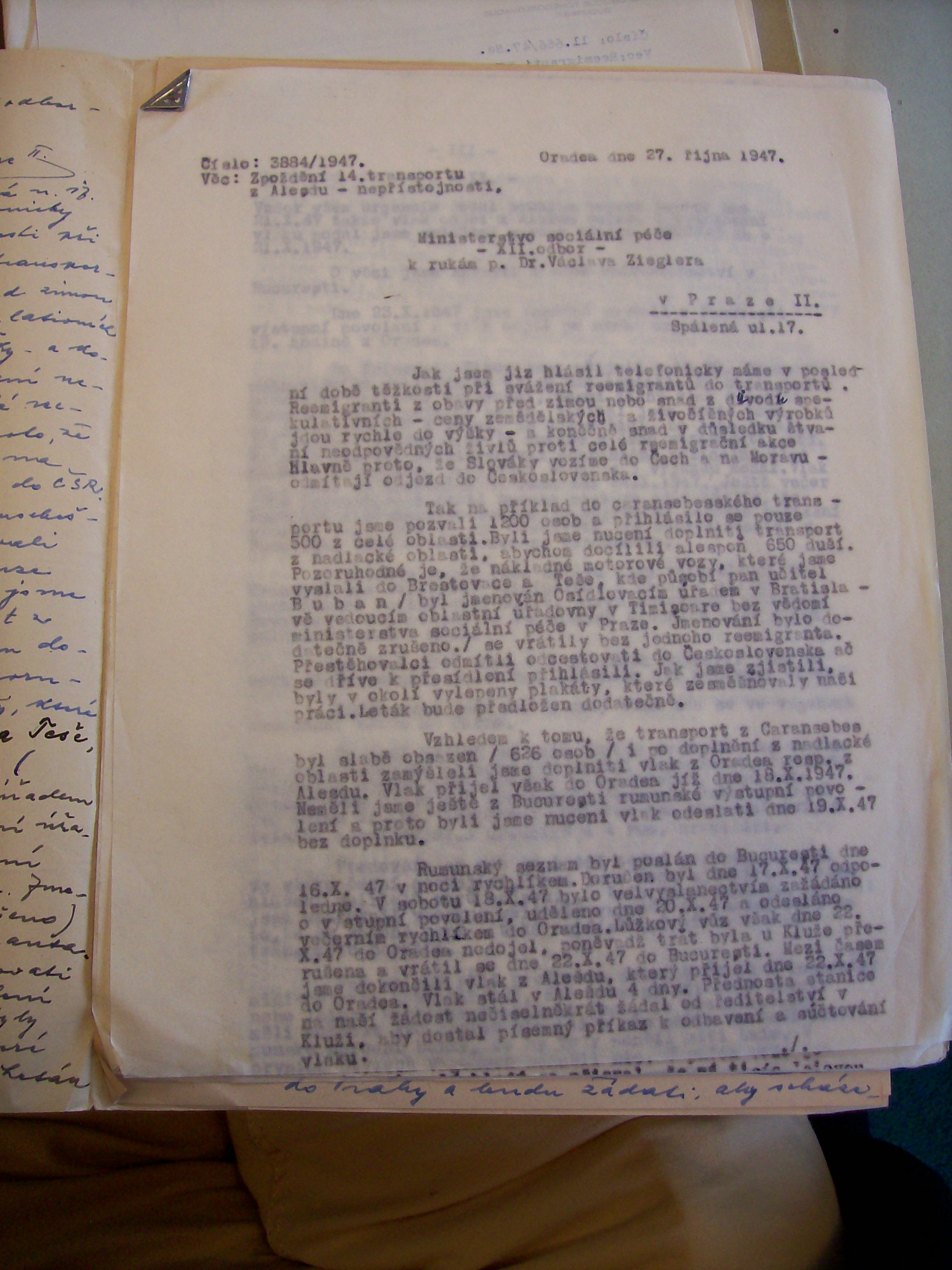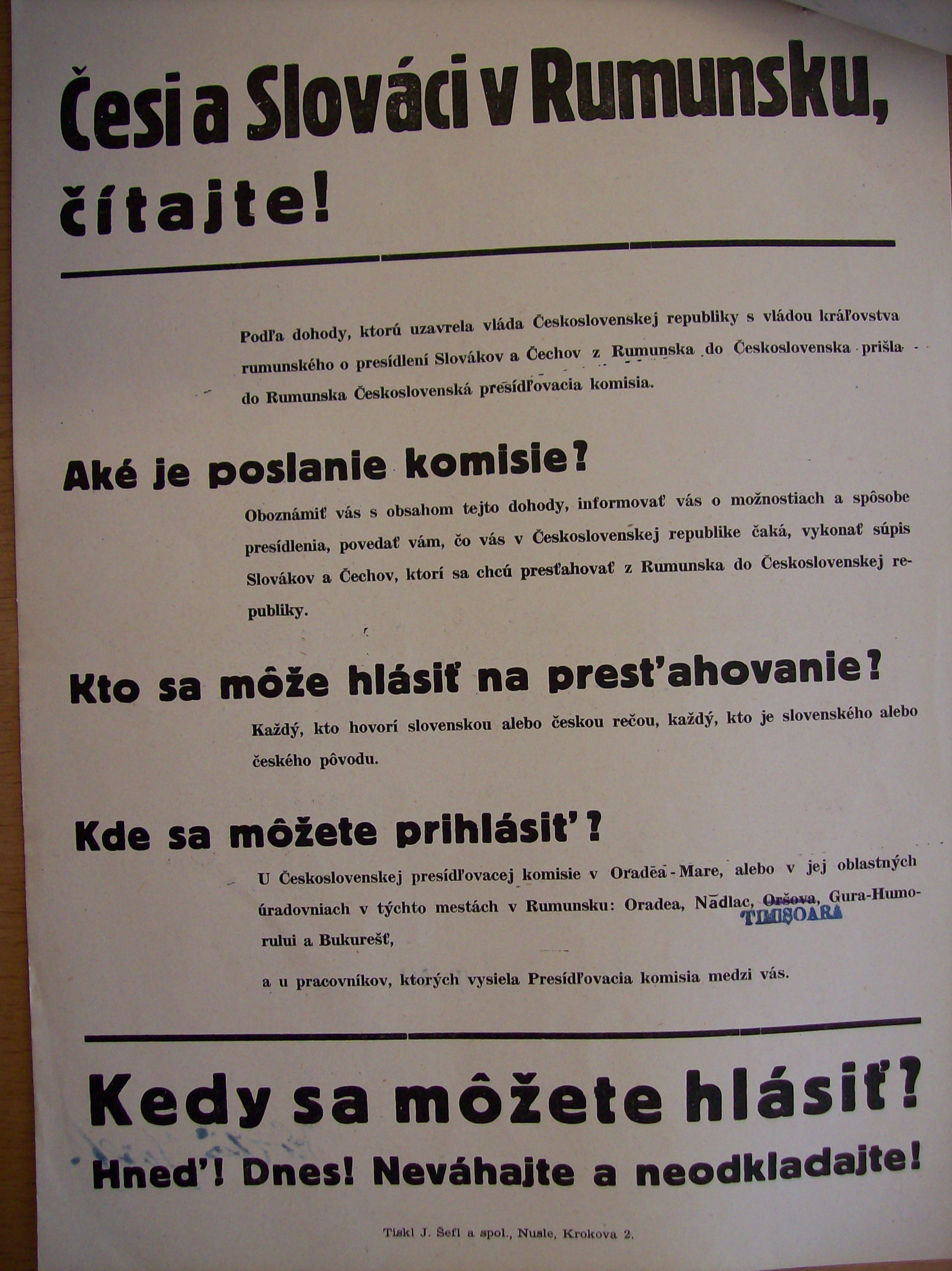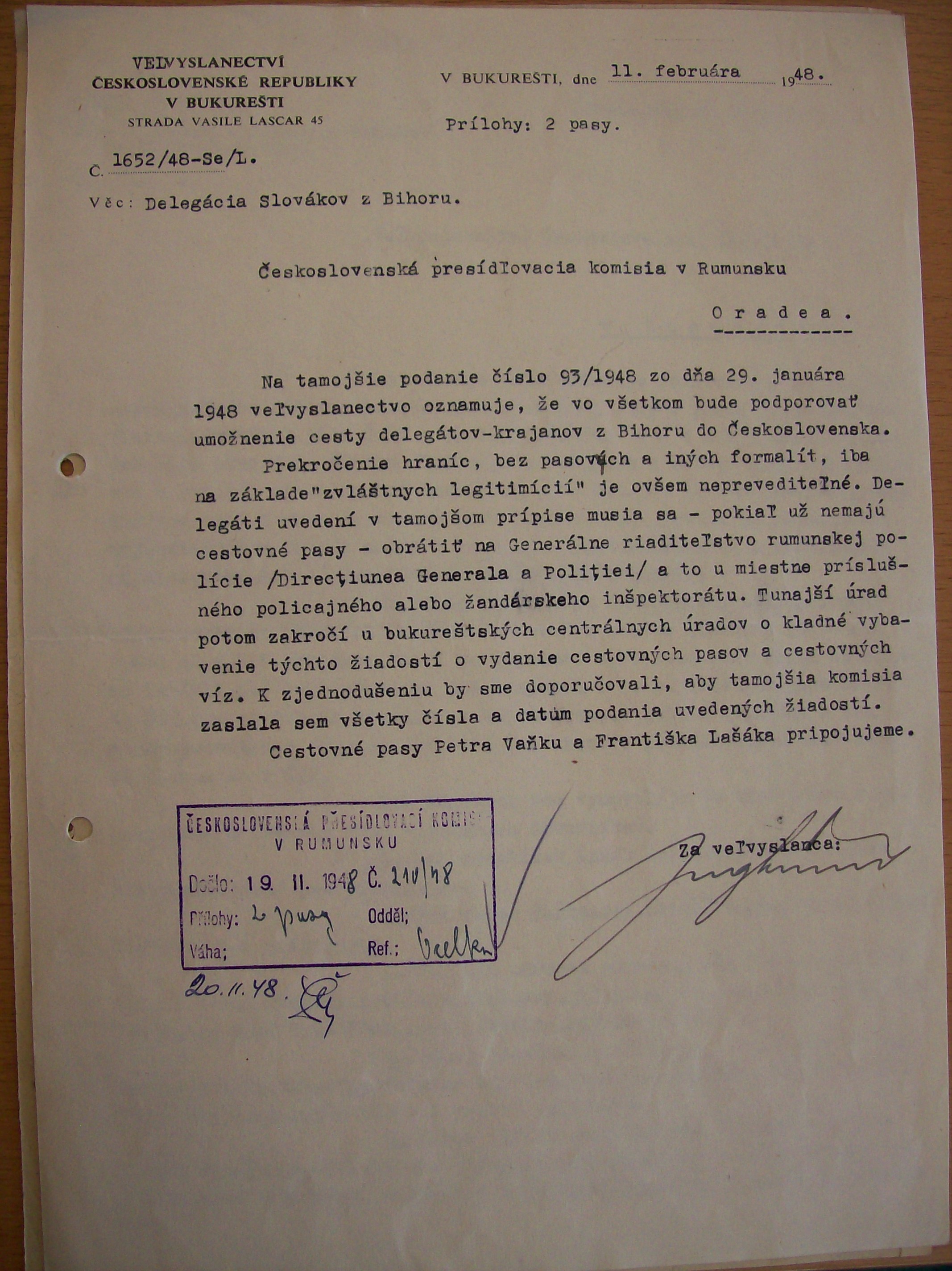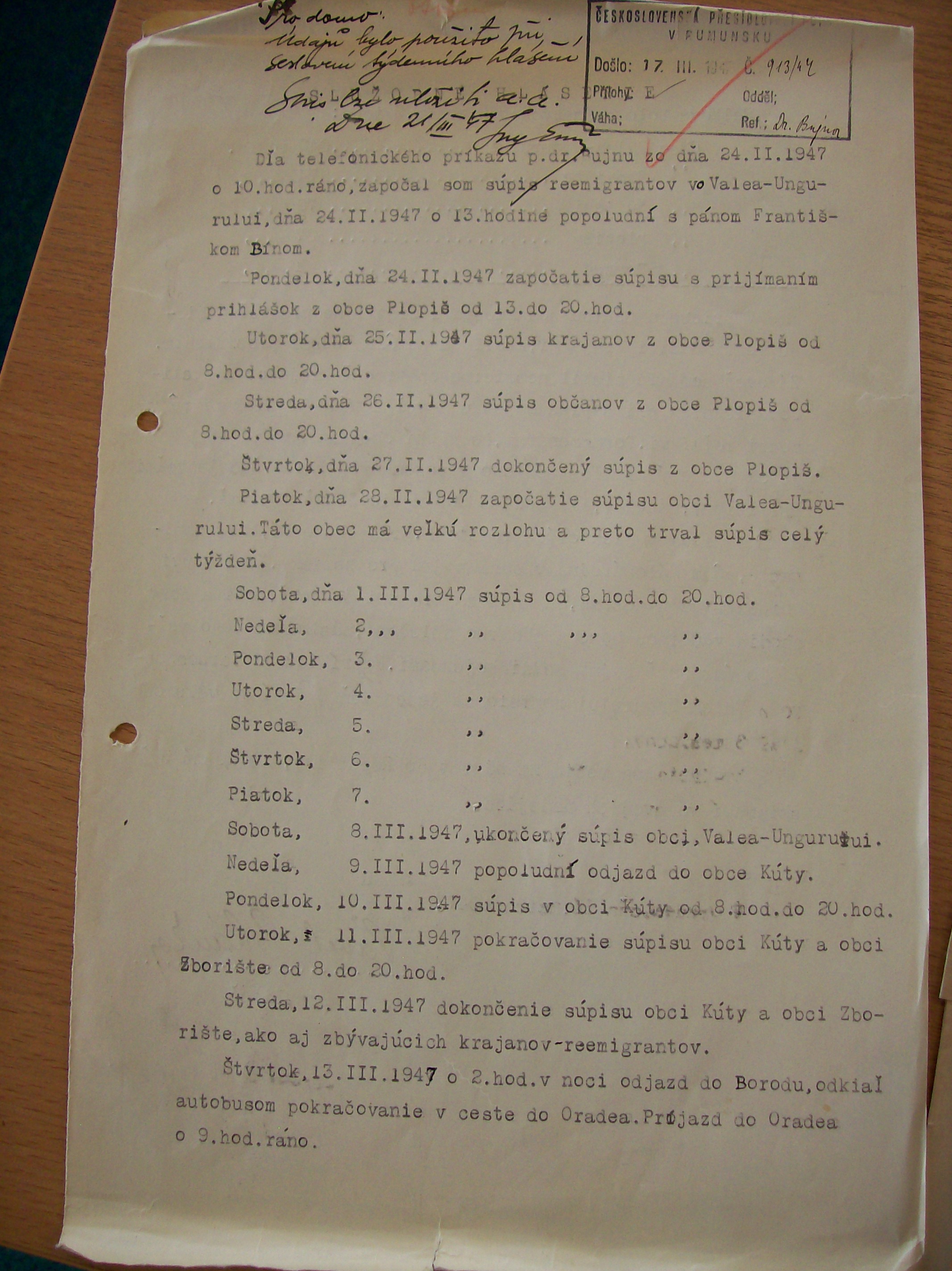 Na této stránce najdete archivní dokumenty ilustrující, jak v letech 1947-49 probíhala organizovaná reemigrace rumunských Slováků do ČSR. (Dokumenty vesměs pocházejí z archivu Československé přesídlovací komise v Oradeji, uloženého v Národním archivu ČR.)