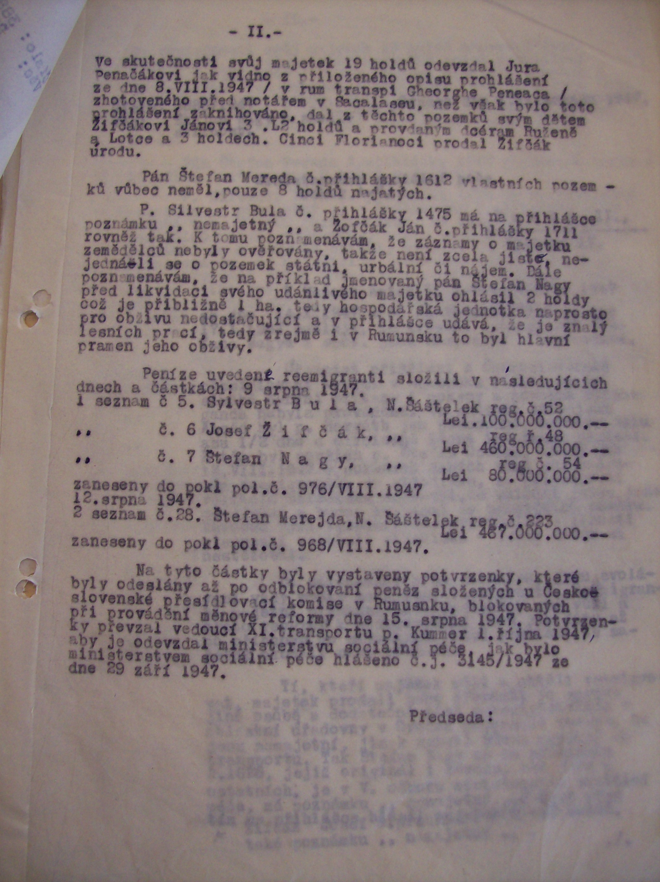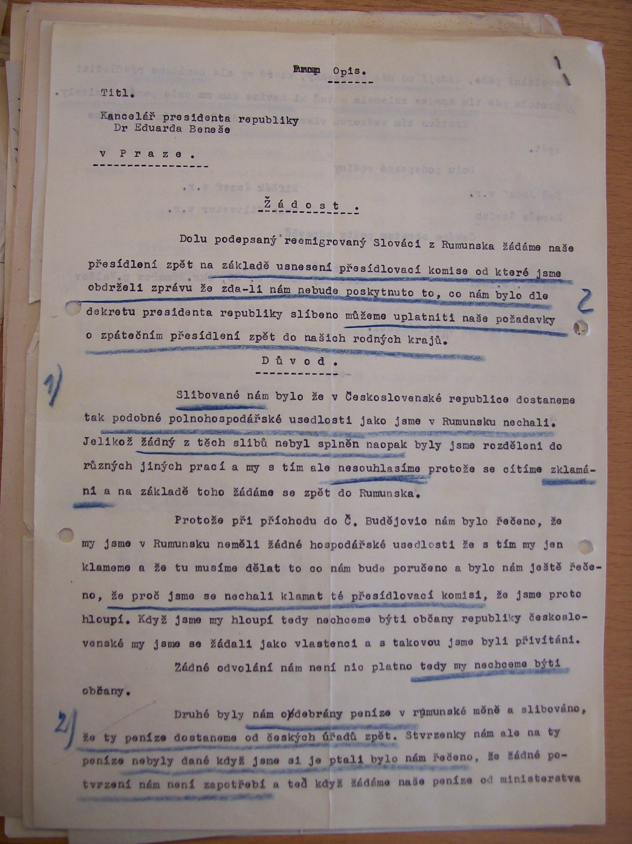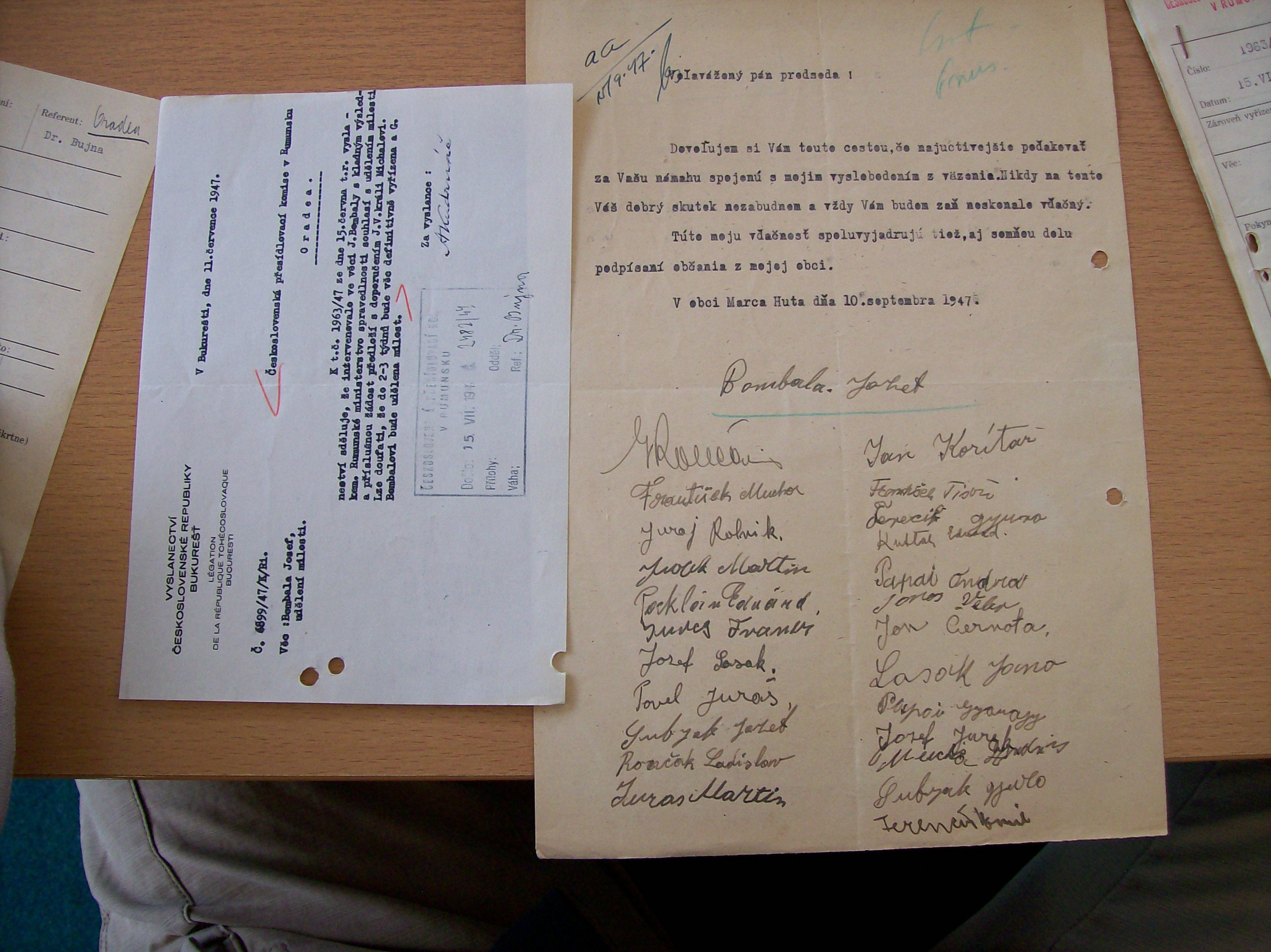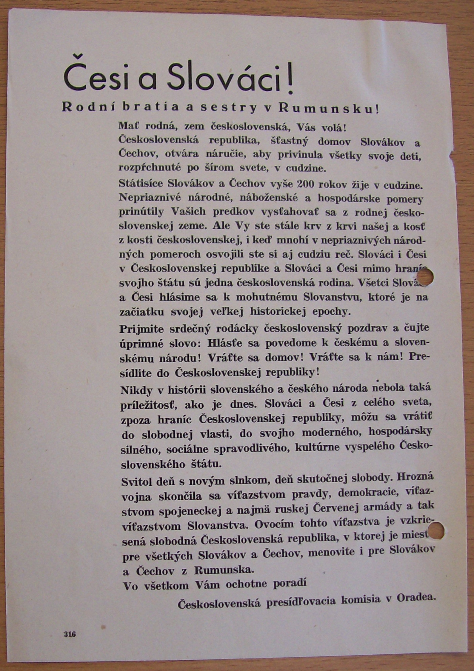 Na této stránce najdete archivní dokumenty ilustrující, jak v letech 1947-49 probíhala organizovaná reemigrace rumunských Slováků do ČSR. (Dokumenty vesměs pocházejí z archivu Československé přesídlovací komise v Oradeji, uloženého v Národním archivu ČR.)