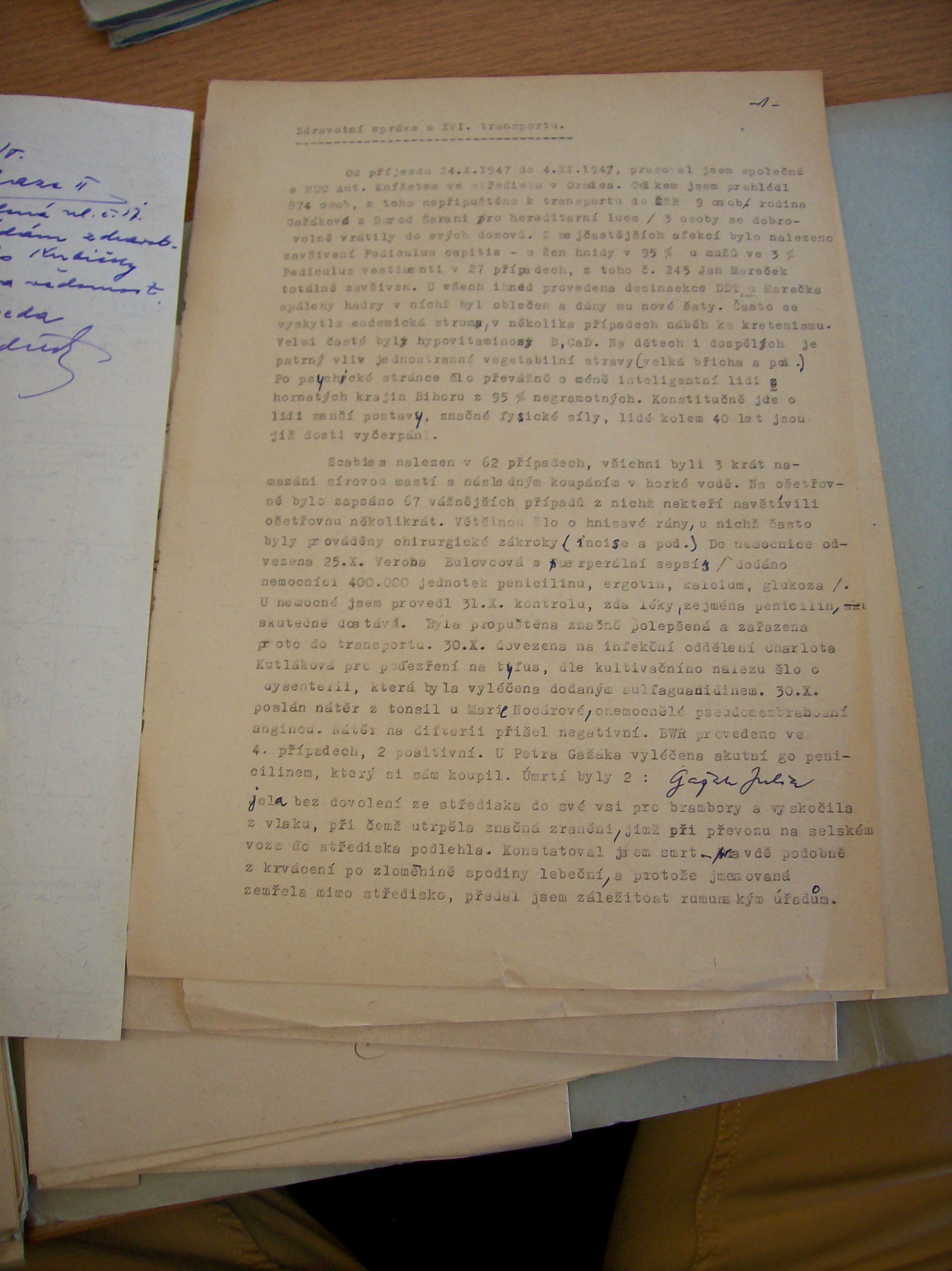 Dochovaná lékařská zpráva k 16. transportu (listopad 1947) ilustruje zdravotní stav slovenského obyvatelstva hlásícího se k reemigraci. Před odjezdem do ČSR byla vyžadována třídenní karanténa ve středisku, léčily se kožní nemoci, zavšivení i vážné choroby, jako např. břišní tyfus. Během pobytu ve středisku docházelo k úmrtím, zároveň se ještě před transportem a během něj obvykle narodilo několik nových dětí.