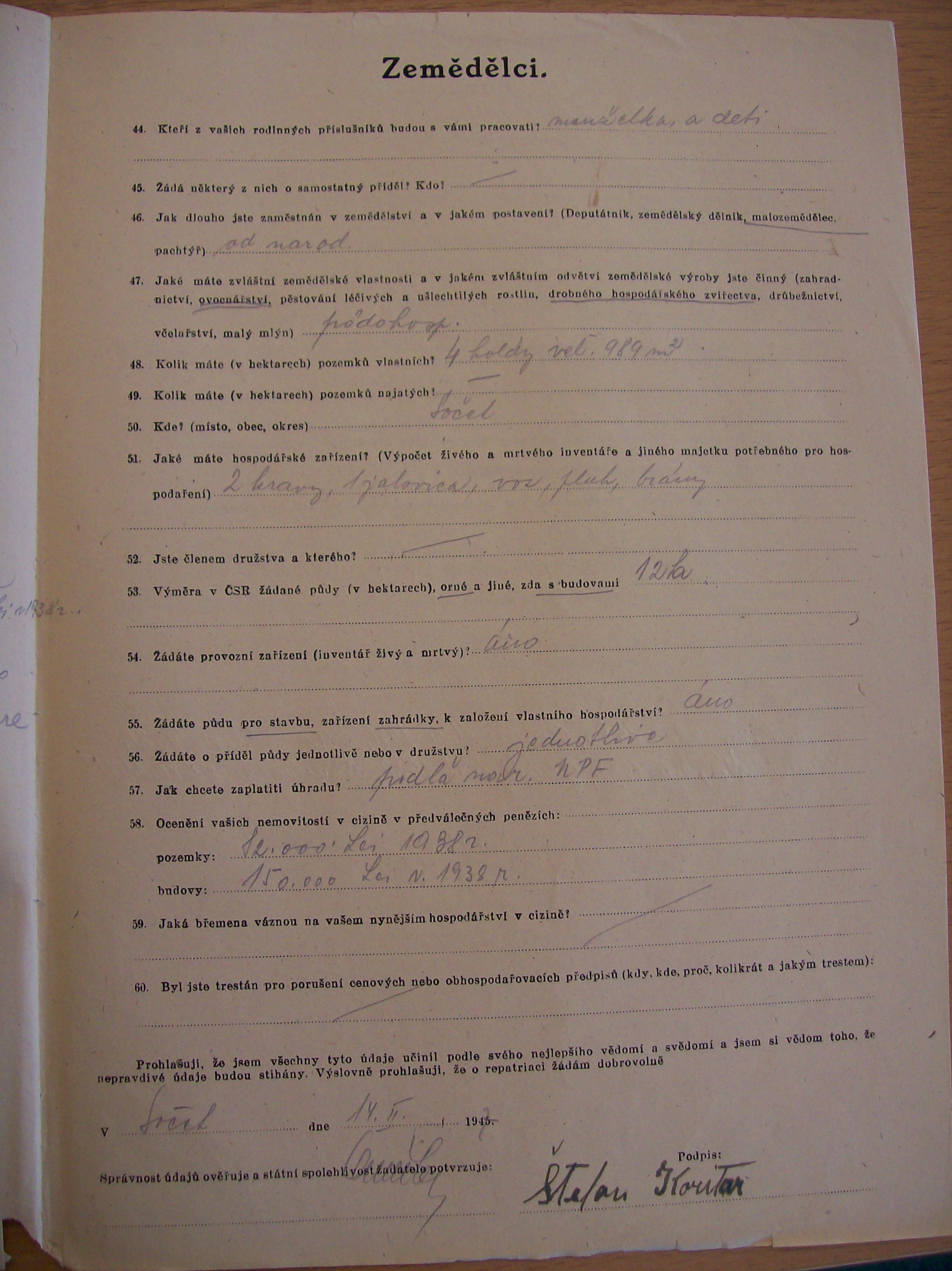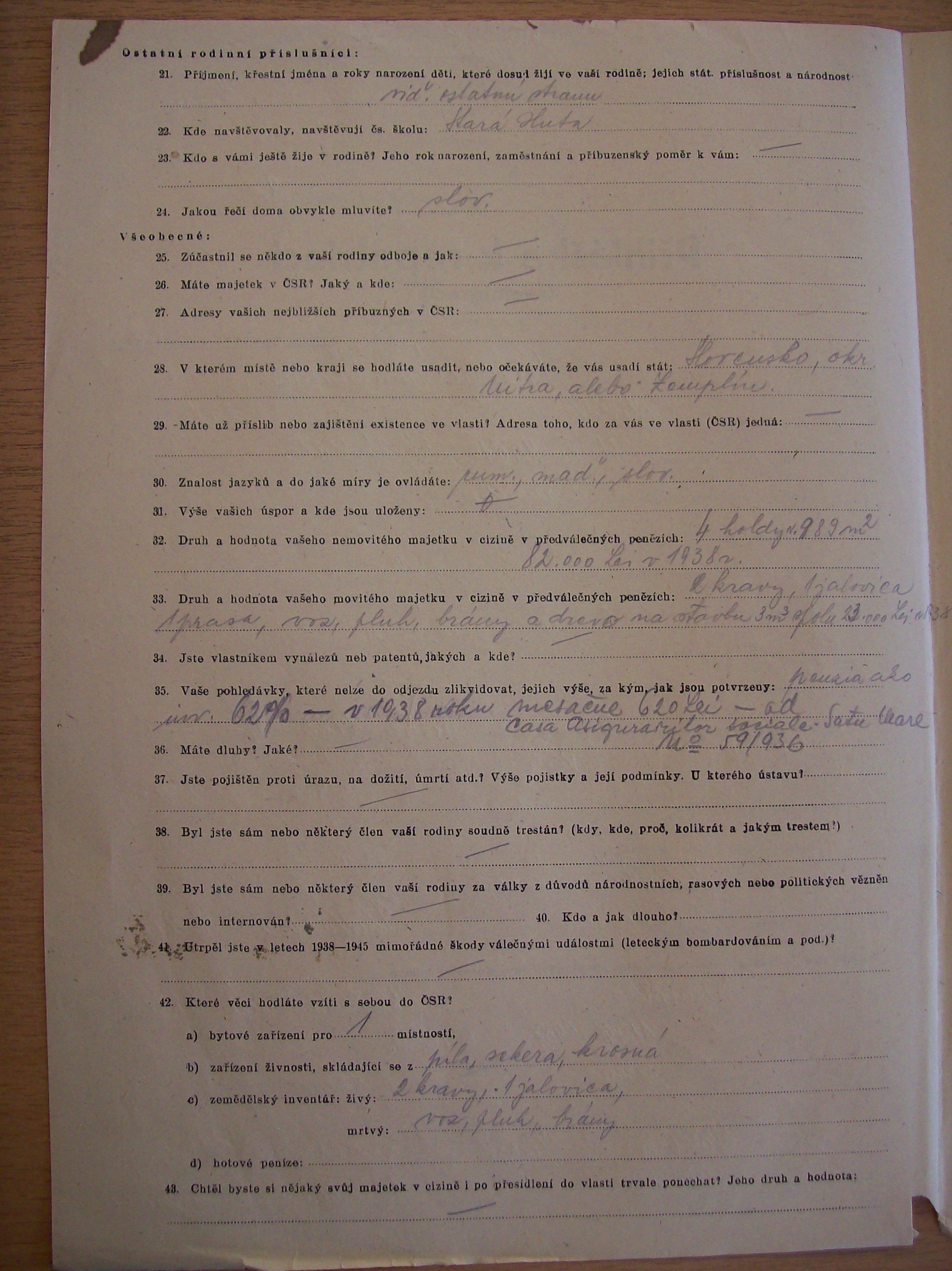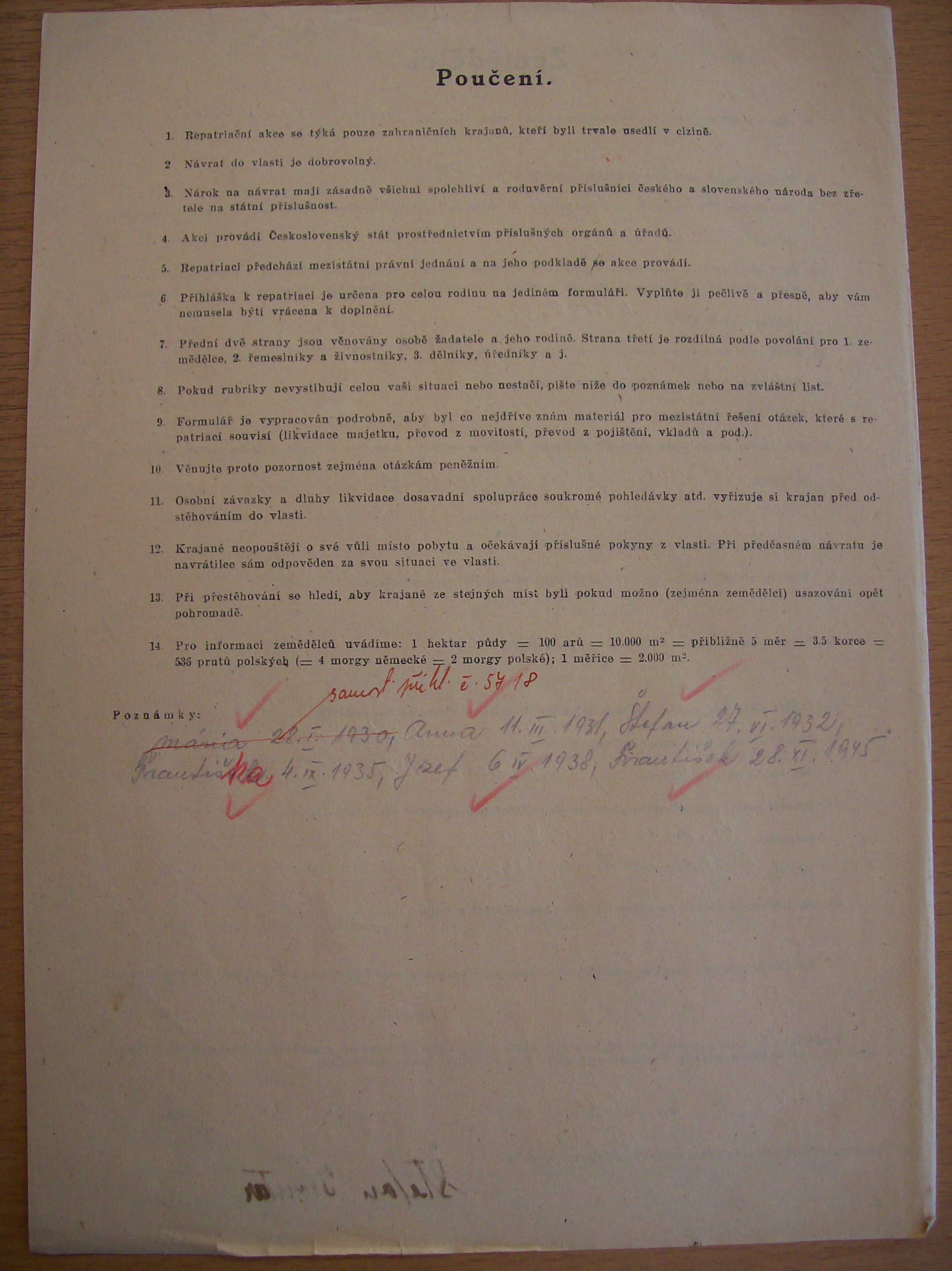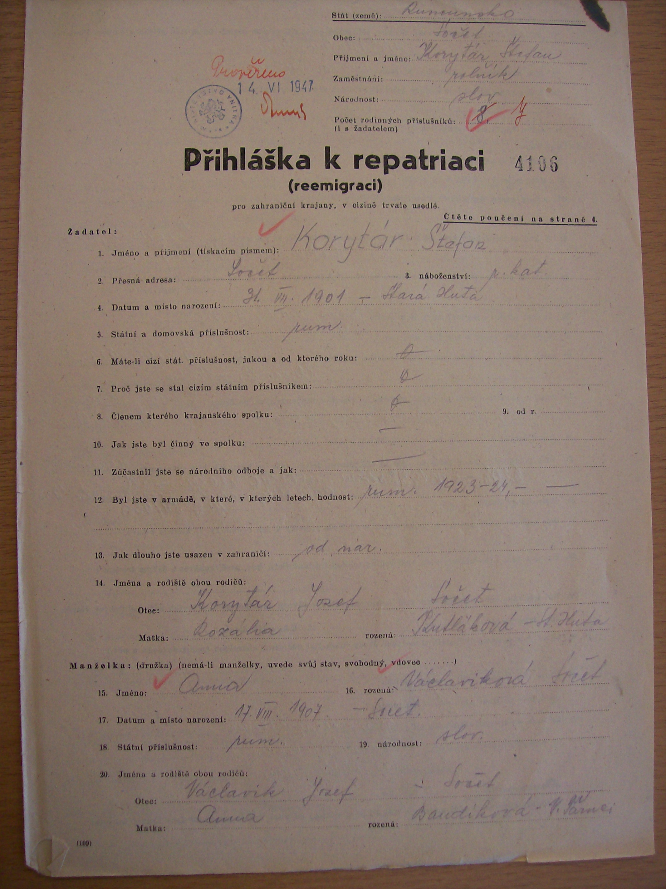 K reemigraci se slovenské rodiny hlásily prostřednictvím vyplnění podrobné přihlášky.