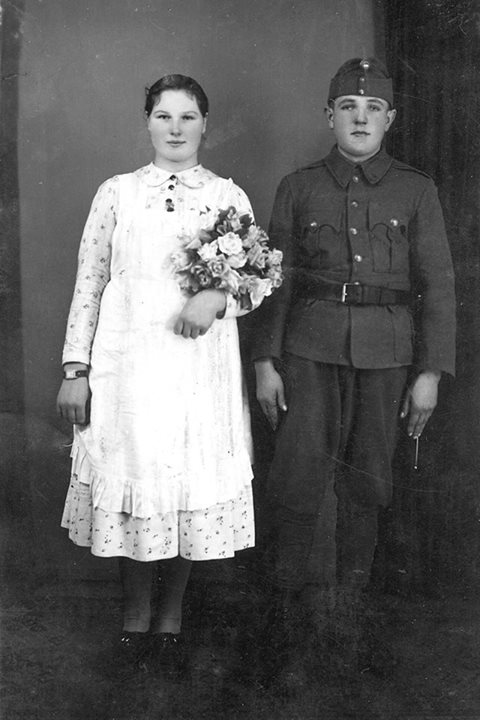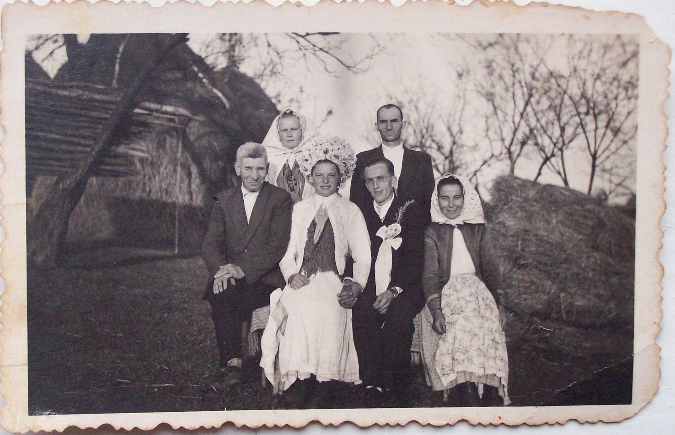 Vpravo: svatba Štefana Koritára (*1932) a Antonie Semmelbauerové (*1933) v říjnu 1957, po boku novomanželů rodiče nevěsty František Semmelbauer a Anna roz. Gocalová, stojící svědkové (Jarošovi?).