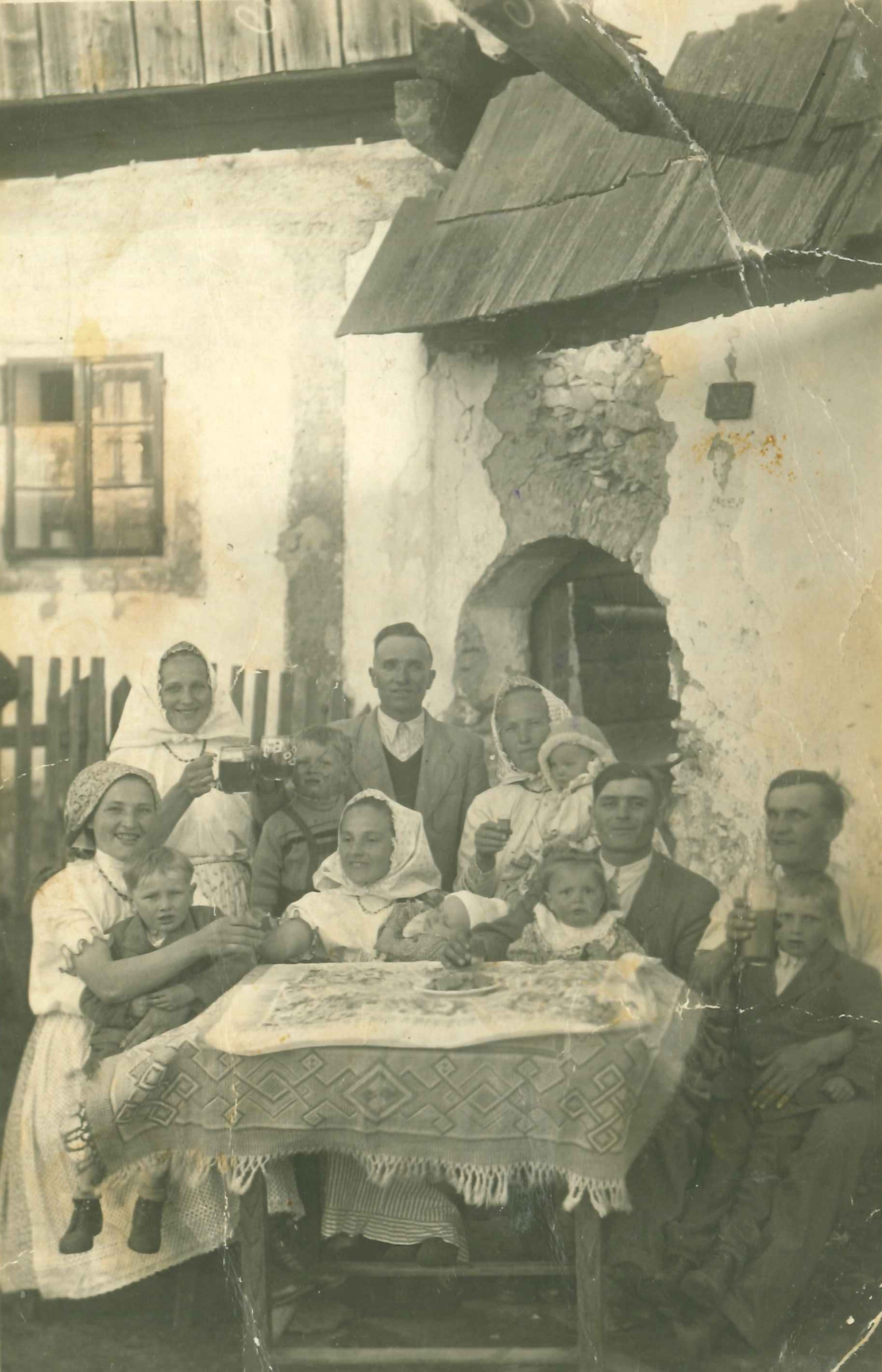Tato fotografie zachycuje rodinné posezení slovenských reemigrantů v Libínském Sedle na Šumavě, okolo r. 1950. Zcela vlevo Berta Tisoňová (roz. Lašáková, *1924), zcela vpravo její manžel Juraj Tisoň (*1919), vedle něj snad jeho bratr s manželkou. Ostatní osoby neznáme. Fotografii poskytla paní Hana Mikšovská.